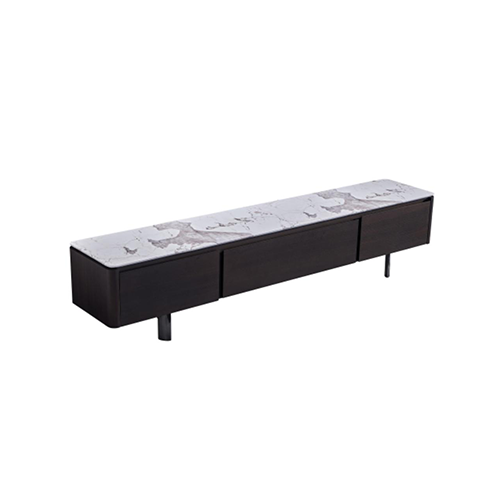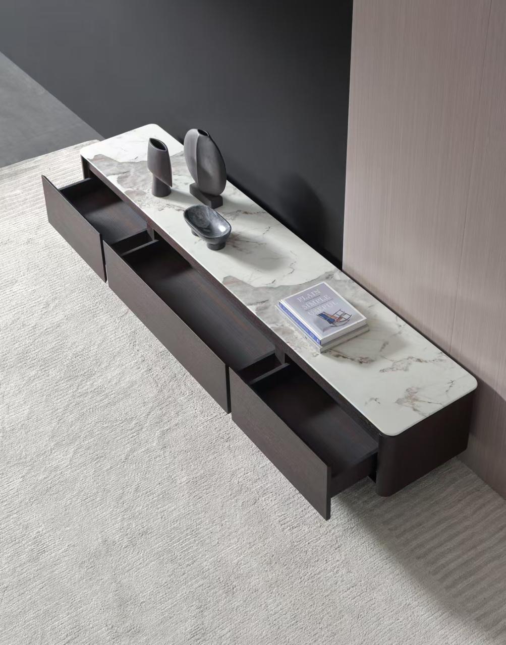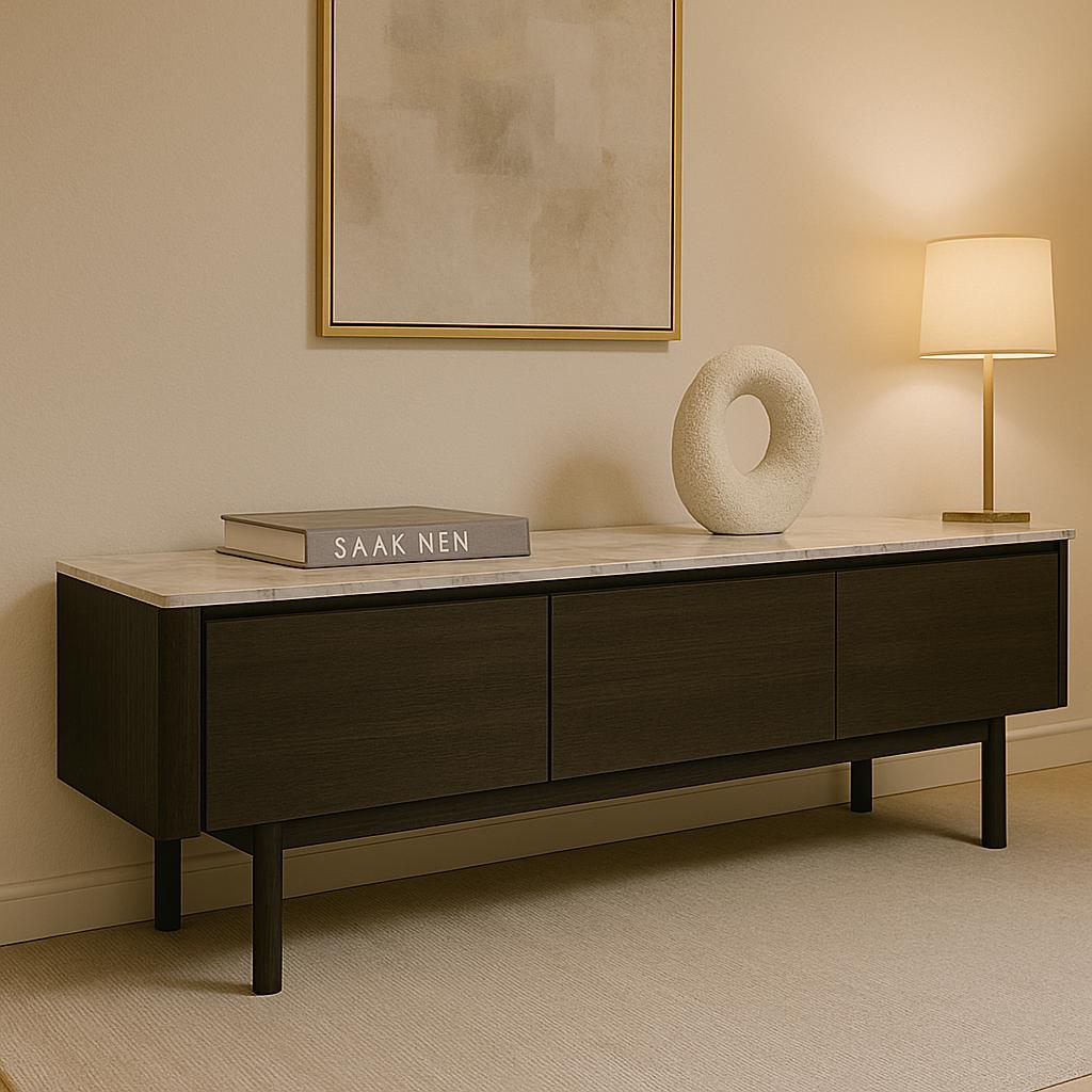 Rack bajo de diseño minimalista con tapa de mármol de Carraca. Su estructura de madera oscura y líneas curvas aportan elegancia y sofisticación a cualquier ambiente.