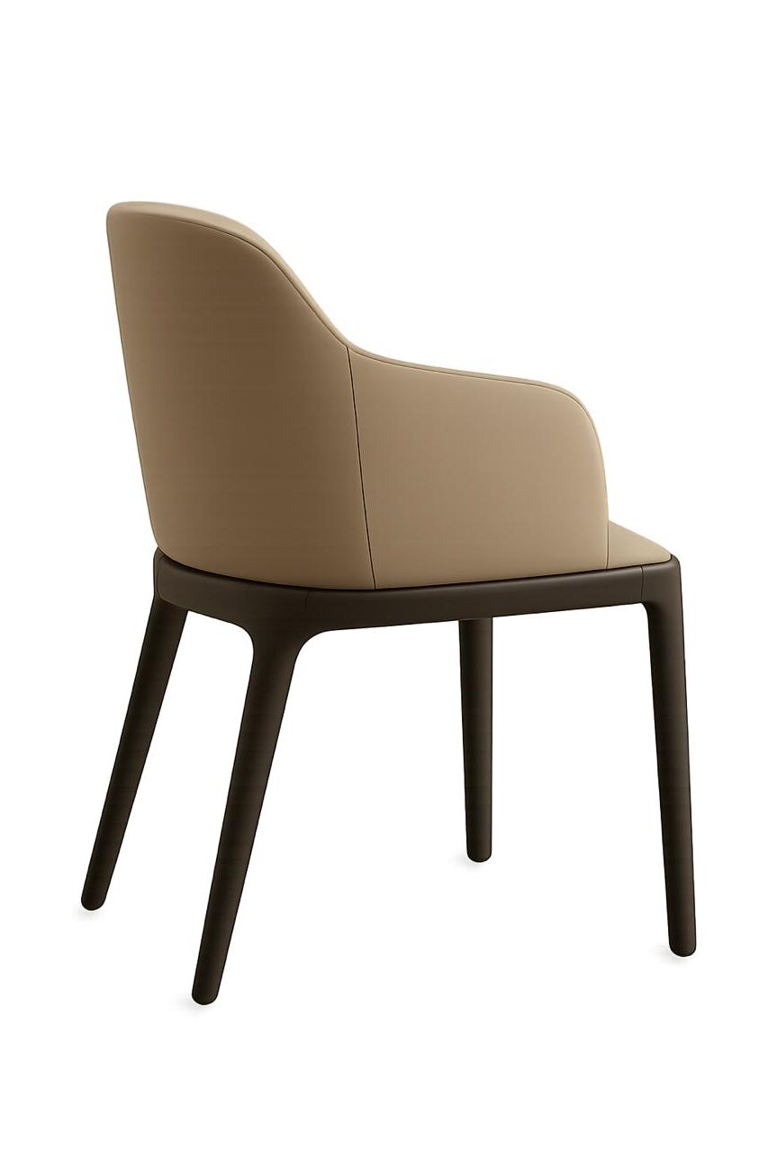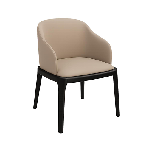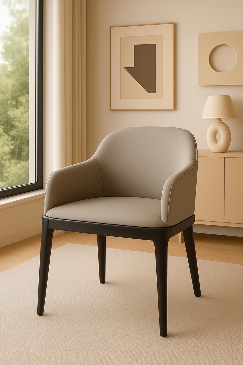 Silla con estructura de madera de Haya teñida de negro, con tapizado en color gris claro.