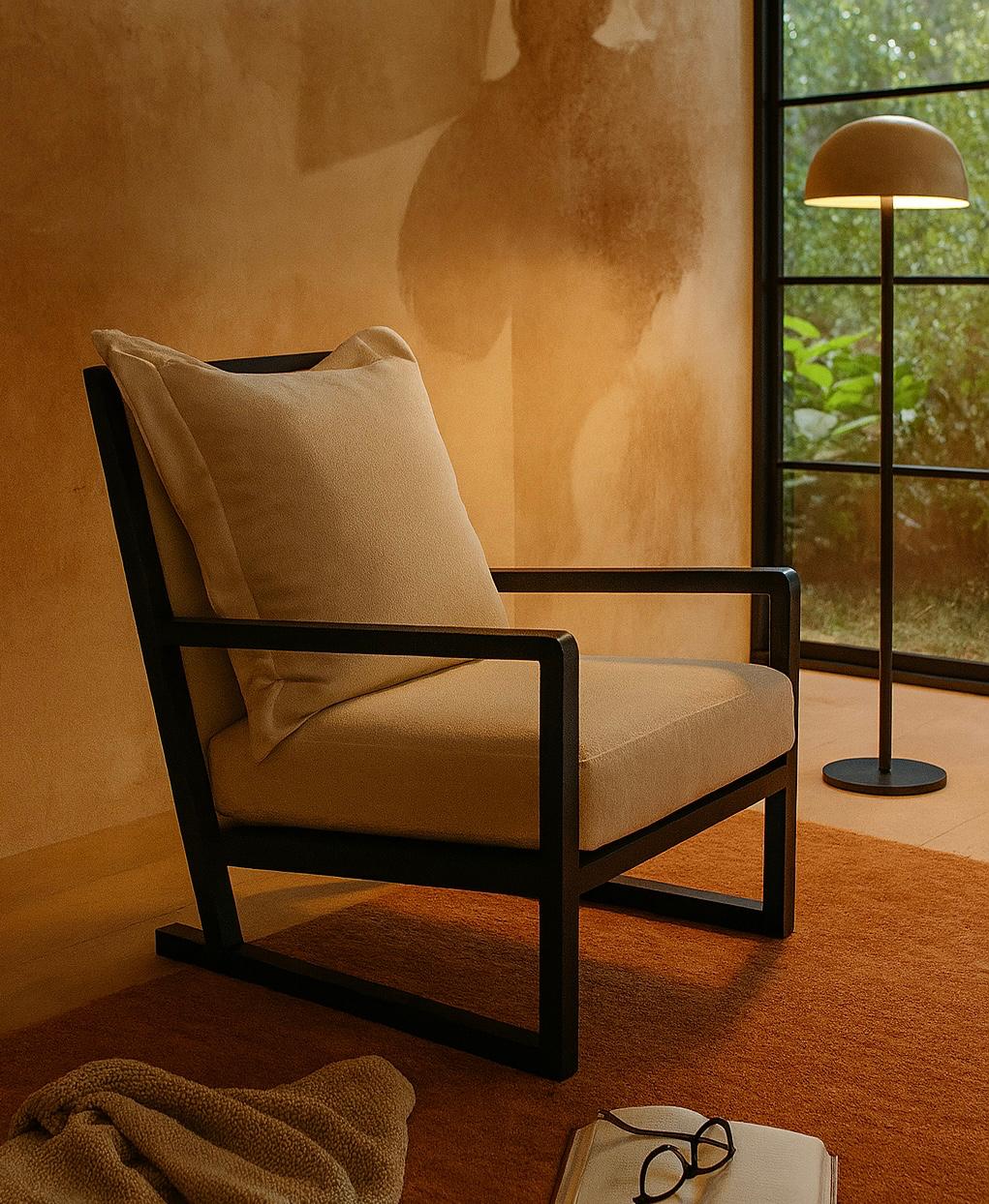 Sillón de líneas puras y estructura solida. Diseño contemporáneo con esencia cálida y funcional.